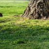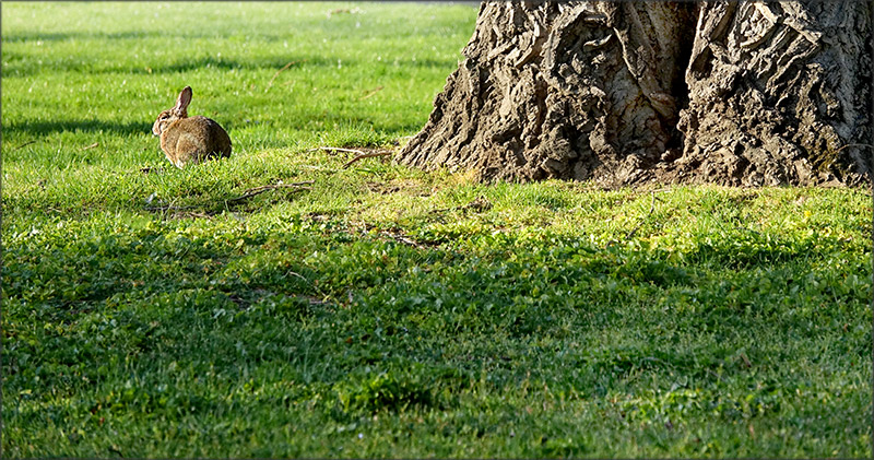 Das junge Wildkaninchen genießt den Sonnenschein inmitten der grünen Frühlingswiese neben dem mächtigen Baumstamm. Sehr schön zu sehen die Rinde des Baumes, die grobförmig zu einem Naturkunstwerk gewachsen ist, mit einer senkrecht verlaufenden Spalte, in der sich einige Tiere einfinden und darin eine Behausung einrichten. Ein schönes Licht- Schatten- und Farbverhältnis.