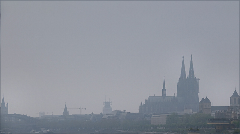 Ja, die Silhouette des Kölner Doms, das Wahrzeichen der Stadt im Morgennebel inmitten des Häusermmeeres, und doch sind noch Details durch den Nebel hindurch zu erkennen. Das Bild hat einen zarten Blauton, wirkt irgendwie romantisch. Die Stadt erwacht zu neuem Leben, auch wenn derzeit noch eine allgemeine Ruhe über dem Land liegt. Ein Bild der Stille und des Friedens.