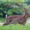 Eine wunderschöne Wiese mit viel Gänseblümchen und mitten darin laufend das ausgewachsene Wildkaninchen, vielleicht steht es auch und streckt einfach nur seinen Körper. Schön zu sehen, das graubraun gefleckte Fell, der Kopf mit den großen dunkelen Augen und den stehenden Ohren - laut der Fachsprache den Löffeln - und das Stummelschwänzchen. Ein schöner Schnappschuss. Der dunkel- und hellgrün bis blauschattig verschwommene Waldhintergrund bringt das Tier schön zur Geltung. Ruhe und Stille gehen von dem Bild aus.