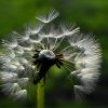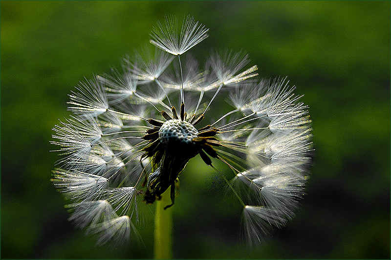 Ein sehr schönes Bild, die weißen Schirmchen der Löwenzahnpflanze leuchten förmlich im Sonnenschein, wunderschön, wie von der Natur gemalt und so geschaffen, dass sie den Zweck erfüllen, die Samen der Pflanze vom Wind hinaustragen zu lassen und sich auf diese Weise ihrer Natur gemäß zu vermehren und die Art zu erhalten. Sehr schön zu sehen, das weiße Köpfchen auf dem grünen Stengel, das die länglich spitzen Samen trägt, wovon schon ein Teil davon geweht wurde. Der dunkel- bis hellgrün gefleckte Hintergrund, bringt das Köpfchen mit den Samen und den Schirmchen schön zur Geltung. Weil Kinder gerne die Schirmchen wegpusten, wird die Pflanze von vielen auch Pusteblume genannt. Es ist ein Wunder der Natur, und wenn wir uns symbolisch als so ein Samenschirmchen vorstellen und uns von der Pflanze lösen und vom Wind davonwehen lassen, dann ist das ein schönes und beglückendes Gefühl von Freiheit.