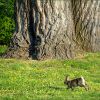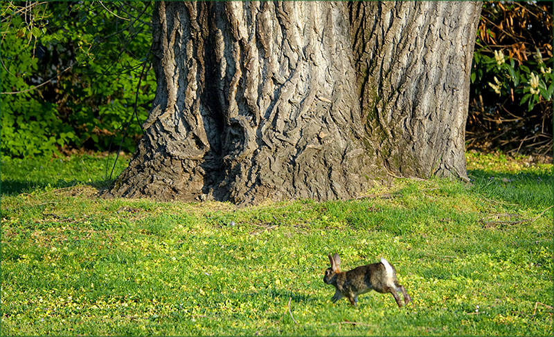 Ein sehr schönes Bild, das laufende oder hoppelnde Wildkaninchen, auf der Wiese vor dem hundert Jahre alten Baumstamm. Es könnten auch zwei zusammen gewachsene Stämme sein, sehr schön zu sehen, die graue tieffurchige Rinde. Es ist herrlicher Sonnenschein, sieht so aus, als brauche die Wiese dringend Regen, schönes Licht- Farbverhältnis.
