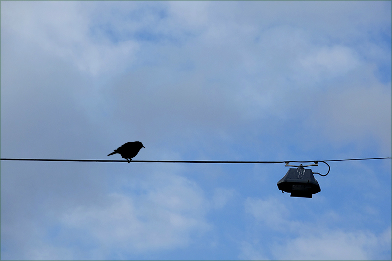 Ein schönes Kunstwerk, menschliche Ziwilisatin neben der Natur. Leider wurde der Natur viel zuviel von uns Menschen genommen, zerstört und vergiftet. Es ist unsere Aufgabe, der Natur soviel zurück zu geben, wie es menschlich nur möglich ist. Mit der Natur in Einklang zu leben, ist ein Grundbedürfnis unseres Menschseins, das leider durch die Zuwendung zu immer mehr Technik verdrängt wurde. Die Folgen sind Abstumpfung des Gefühlslebens, daraus folgend psychisches Leiden, sogar auch Krankheit und Tod...Auf jeden Fall ein schönes Bild, das Amselchen auf der Stromleitung neben der Laterne, mit dem blauen Himmel und den weißen Wolken im Hintergrund.