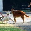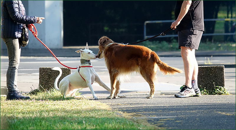 Ein sehr schönes Bild, Begegnung zweier Menschen und gleichzeitig die Begegnung ihrer Hunde. Schön zu sehen wie die Tiere sich beschnuppern, voller Sehensfreude und gegenseitiger Hingabe. Ein sehr schönes Farbzusammenspiel der beiden Tiere und ein schönes Sonnenlicht- Schatten- und Farbverhältnis. Auch ein Bild der Harmonie und des Friedens.
