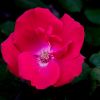 Ein wunderschönes Bild, beim Betrachten der Rose geht das Herz auf, sie leuchtet herrlich rot bis zartviolett, von der Sonne bestrahlt. Sehr schön zu sehen der weiße bis violettfarbene Mittelteil umgeben von den leicht gewellten Blütenblättern. Die Rose blüht einfach, sie verströmt sich ohne Frage, das ist Liebesenergie, die die Natur uns schenkt. Hinzu kommt ihr lieblicher Duft, mit dem sie Bienen und Hummeln anlockt. Der dunkele Hintergrund mit den grünen Blättern des Srauches, bringt die Rose schön zur Geltung.