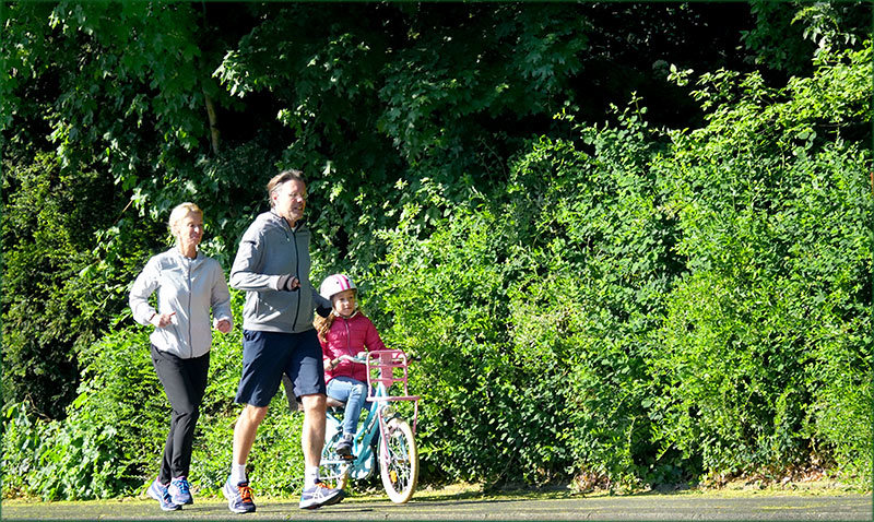 Ein sehr schönes Bild, Mutter, Vater und Kind gemeinsam beim Joggen am Waldrand. Es ist herrlicher Sonnenschein und die frische Luft angenehm, vielleicht auch Gesang der Vögel. In der Familie ist Harmonie und es sind liebevolle Eltern, das Kind hat ein gesundes und glückliches zuhause. Das Bild vermittelt Harmonie und Frieden, auch ein schönes Licht- Farbverhältnis.