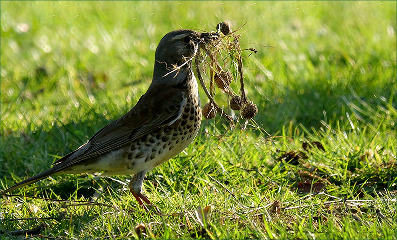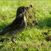 Ein schöner Schnappschuss, die Drossel beim Sammeln von Nistmaterial, sie trägt da einiges zusammen. Ich staune immer wieder darüber, wie die Vögel, ohne es abgeguckt zu haben, genau wissen mit welchem Material und welcher Technik sie das Nest bauen müssen, damit es zur Brut der Eier und der Aufzucht der Jungen geeignet ist. Schön zu sehen das Gefieder der Drossel und das trockene Pflanzenmaterial das sie im Schnabel hält. Ein schönes Licht- Schatten- und Farbverhältnis.