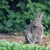 Ein sehr schönes Bild, das Wildkaninchen vor dem grünen laubbewachsenen Buschwerk sitzend, auf unbewachsenem Boden, am Rand der Wiese. Es schaut vertrauensvoll zum Fotografen hin und genießt den herrlichen Sonnenschein in seiner ganz natürlichen Freiheit. Wunderbare Natur, ein Bild der Harmonie und des Friedens.
