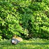 Ein sehr schönes Frühlingsbild, mit der Taube und dem jungen Kaninchen auf der Wiese am Waldrand. Es ist herrlicher Sonnenschein mit langen Schatten, und die Tiere weiden friedlich nebeneinander. Liebe und Harmonie gehen von dem Bild aus.