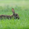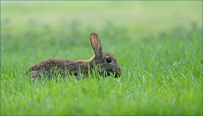 Das Wildkaninchen geduckt im saftigen Gras liegend auf der grünen Wiese, den Kopf angehoben, schaut und lauscht es, mit großen dunkelen Augen und aufrecht stehenden Löffeln. Das Gras im Vordergrund und das weiter hinten stehende und der verschwommene grüne Hintergrund, bringen das Tierchen schön zur Geltung. Ein schönes Licht- Farbverhältnis, und Harmonie und Frieden gehen von diesem Bild aus.
