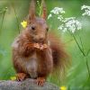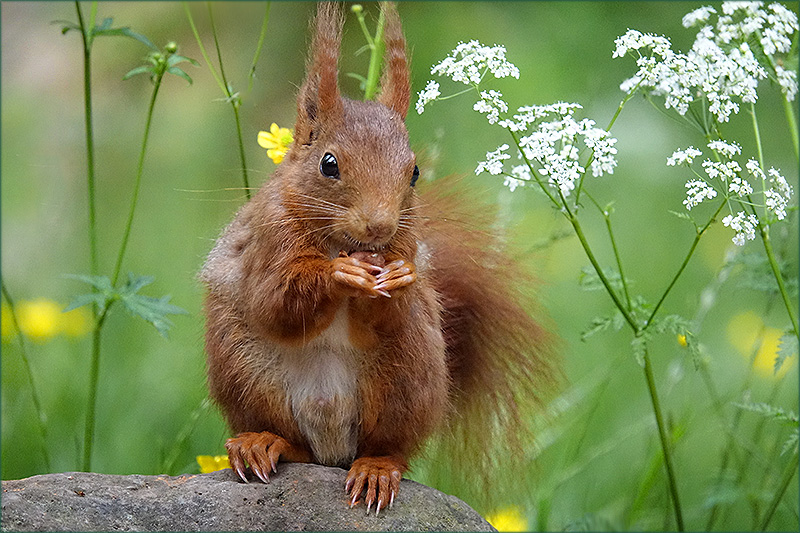 Ein wunderschönes Bild, ganz mit sich selbst im Einklang und voller Vertrauen, sitzt das Eichhörnchen aufrecht auf dem grauen Steinbrocken und verzehrt eine Nuss, die es in den Vorderpfoten hält. Sein offener Blick ist nach vorne gerichtet, und schön zu sehen die großen dunkelen Augen. Auch schön zu sehen das rotbraune Fell und das weiße Brüstchen. Ringsumher die verschiedenen wilden hohen Stielpflanzen mit weißen Dolden und gelben Blüten und der verschwommen grünlich gefleckte Hintergrund, bringen das Tierchen schön zur Geltung. Das Bild verströmt Seelenwärme, Harmonie und Frieden. Auch ein schönes Licht- Farbverhältnis.