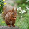Lieblich steht es auf dem großen grauen Steinbrocken, umgeben von den weißen Dolden des Wiesenkerbel und den gelben Blüten des Hahnenfuß, und verzehrt in Seelenruhe seine Nuss. Es ist dabei hellwach und voller Vertrauen. Das süße Köpfchen mit den großen dunkelen Augen und den aufrecht stehenden Ohren, das süße Körperchen mit dem rotbraunen Fell und der buschige Schwanz, machen das Eichhörnchen zu diesem süßen Tierchen, das unsere Herzen erfreut. Das von der Natur verschwenderisch hervorgebrachte Frühlingsgrün, gibt dem Bild eine wohltuende Frische, und es verströmt Harmonie und Frieden.
