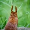 Das Eichhörnchen zeigt uns diesmal seinen Rücken, und man sieht an seinen gespitzten Ohren, dass es voller Wachsamkeit ist. Sicherlich wird es etwas futtern, während es auf dem großen grauen Steinbrocken sitzt. Der schöne und etwas verschwommene, mit hohen grünen Pflanzen bewachsene Hintergrund, bringt das Tierchen entsprechend zur Geltung, auch ein schönes Licht- Farbverhältnis.