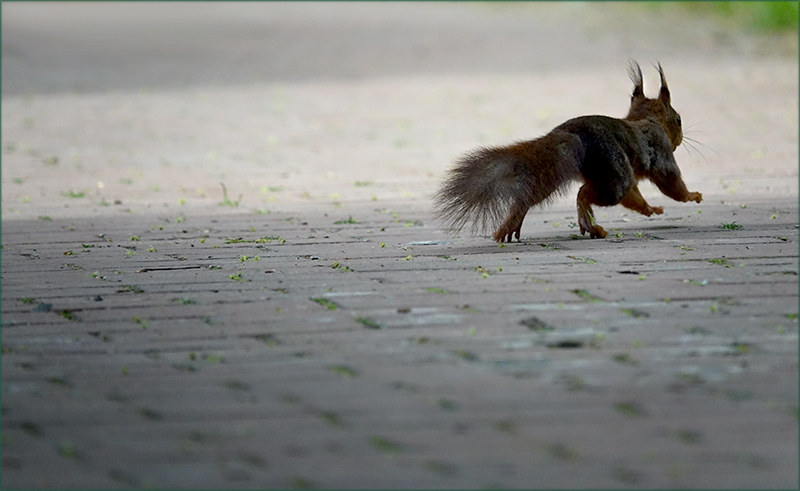 Flink wie ein Wiesel huscht es über das graue Betonsteinpflaster. Sehr schön zu sehen seine Haltung während des Laufens und Springens. Es bewegt sich im Schatten und hinaus ins Sonnenlicht. Sehr schön getroffen, auch ein schönes Licht- Schattenverhältnis.