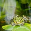 Als siebzehnjähriger hatte ich einmal in einem Teich Froschlaich entdeckt, und ein Klümpchen davon mitgenommen. Zu Hause füllte ich ein großes Konservenglas mit klarem Wasser bis kurz unter den Rand, stellte ein kleines Büschel Gras mit Erde hinein und legte den Froschlaich hinein. Das Glas stellte ich zur Südseite hin auf eine Fensterbank. Jeden Tag beobachtete ich was sich da im Glas abspielte. Nach wenigen Tagen begannen die kleinen dunkelen Pünktchen in der Mitte der Eier größer zu werden und das Gras wuchs aus dem Wasser heraus, das immer klar blieb. Dann wuchsen aus den Pünktchen in den Eiern kleine Larven, das wurde immer spannender, die wurden größer und größer und bald waren kleine Kaulquappen daraus geworden, die hatten einen großen Kopf und einen dünnen breiten Schwanz, mit dem sie sich durch schlängelnde Bewegungen fortbewegten und sie hatten winzige Mäulchen und Äugelchen. Meine Spannung steigerte sich, der Kopf der Kaulquappen formte sich etwas länglich und zwischen Kopf und Schwanz wuchsen kleine Hinterbeinchen heraus. Als diese ausgewachsen waren, wuchsen kleine Vorderbeinchen heraus bis diese ausgewachsen waren, und es waren kleine Fröschlein, mit Schwänzchen. Die Schwänzchen wurden kleiner und kleiner und es waren nun alles kleine junge Fröschlein, die ich wieder in den Teich zurückbrachte. Das war ein so spannendes Erlebnis, da hätte ich nichts anderes gegen eingetauscht, ich war einfach nur glücklich dabei...Wieviele es davon geschafft haben so groß zu werden wie dieser schöne Frosch hier in dem Teich, kann man nicht wissen, denn ein Teil von ihnen werden zur Beute von anderen Tieren. Ein sehr schönes Bild mit den grünen Wasserpflanzen und dem Frosch, der sich an einem großen grünen Blatt mit den Vorderbeinchen über Wasser hält. Er wartet sicherlich auf Insekten, die er mit seiner langen Zunge schnappt und verspeist.