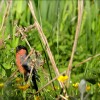 Er zupft sich mit seinem Schnabel die Samen aus einer Löwenzahnknospe
