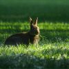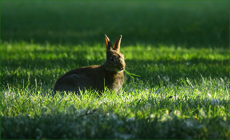 Ein wunderschönes Sonnenlicht- Schattenbild, die grüne Wiese, auf der das Wildkaninchen friedlich liegt mit gehobenem Kopf, aufmerksam aufgerichteten Ohren und wachsamem Blick und genüsslich Gras futtert. Die linke Seite und das Brüstchen des Tieres vom Sonnenlicht angestrahlt und die rechte Seite dem Schatten zugewendet. Ruhe und Stille gehen von dem Bild aus und Harmonie und Frieden.