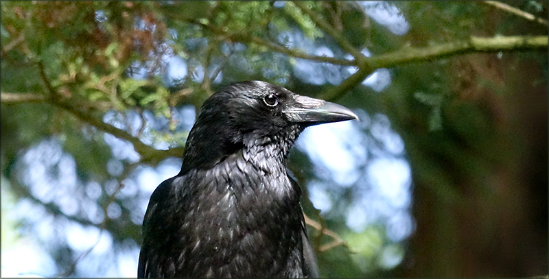 Herrlich glänzt sein Brustgefieder im Licht der Sonne, ein Auge dem Fotografen zugewendet, sein Gesicht mit dem kräftigen Schnabel wirkt ernst. Der Rabe gestochen scharf, und der Hintergrund mit dem hellen Tageslicht, das zwischen den belaubten grünen Ästen und Zweigen hindurchscheint und dem Baumstamm rechts im Bild, verschwommen. Das ernste Gesicht der Raben wirkt auf mich, als würden sie uns etwas sagen, das uns aufwecken soll aus dem Dämmerzustand, in dem viele Menschen ausharren und mögliche Gefahren nicht erkennen, sei es der übermäßige Konsum oder die übermäßige Produktion der Industrienationen, ganz besonders die Produktion von Giftstoffen, die Waffenproduktion und die hohen Emissionen in die Atmosphäre, die zum Schaden unser aller sind und sehr zum Schaden der gesamten Natur...Sehr schön das Bild, es verströmt Harmonie und Frieden. Sehr schönes Licht- Farbverhältnis.