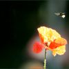Ein fotografisches Kunstwerk, dieses Licht, die Farben, auch das wegfliegende Hummelchen in diesem schönen Lichtstrahl, und die Mohnblüte leuchtet förmlich gelb, bis gelborange und rotorange und links in der oberen Ecke, die Samenkapsel auch hell angestrahlt und die Stengel weißbehaart, leuchten im Licht der Sonne. Der dunkele bis bläulich grüne Hintergrund bringt diese schönen Lichtelemente, mit dem Hummelchen, der Blüte und den Pflanzenteilen in der Mitte, schön zur Geltung. Eine wunderbare Harmonie.