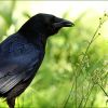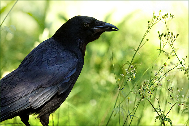 Der sprechende Rabe, ich meine jetzt nicht, dass er in Worten spricht, sondern in seiner ganzen Erscheinung, sein Blick, wie er den Kopf hält und den Schnabel. Sehr schön zu sehen sein Federkleid, das zum Teil von der Sonne angestrahlt wird und bläulich schimmert. Der grünstengelige Pflanzenwuchs auf der rechten Seite des Bildes und der grüne mit Licht gefleckte Hintergrund, bilden zusammen mit dem Vogel eine wunderbare Harmonie.