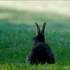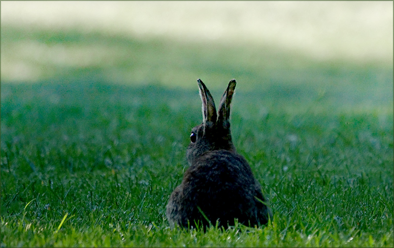 Man könnte meinen, das Wildkaninchen schaut mit dem linken Kullerauge hinter sich, voller Wachsamkeit und doch ohne Furcht. Diese Wachsamkeit braucht es um in der Natur zu überleben, denn es kann leicht zur Nahrung für andere Tiere werden. Ein schönes Bild, die Wiese im Schatten und hinter dem Tierchen Sonnenschein, auch ein schöner Horizont, das Verschwommene gibt ihm einen besonderen Reiz. Ruhe und Frieden gehen von dem Bild aus, wunderbare Harmonie.