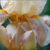 Eine prachtvolle Blüte, ein Kunstwerk der Natur, diese harmonische Zusammenstellung der Farben, von weiß, gelb, orange bis zur sparsam von der gerillten zart violetten Struktur der Blütenblätter. Der grün, bis bläulich gefleckte Lichthintergrund bringt die Iris im Sonnenlicht mit Schattierung und den zum Teil durchleuchteten Blütenblättern schön zur Geltung. Ein Ruhepol für Geist und Seele.