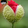 Schön zu sehen wie sie aufspringt und die Blütenblätter sich langsam entfalten. Es wird eine schöne rote Blüte werden. Auch schön zu sehen die Pickelchen auf der hellgrünen Schale der Knospe die alle ein Haar tragen, die aussehen, als wären es Stachel. Auch schön das fliegende Hummelchen noch halb im Bild zu sehen. Eine schöne Farbkombination. Der grünlich bis bläulich und zart rot gefleckte Hintergrund, bringt die aufgesprungene Mohnknospe und die Hummel schön zur Geltung.