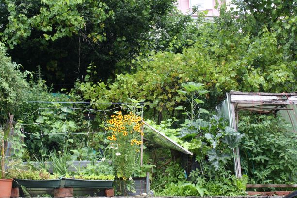 Unter dem Gurkengitter - in der mitte - hab ich noch eine wiesenblumenmischung ausgestreut