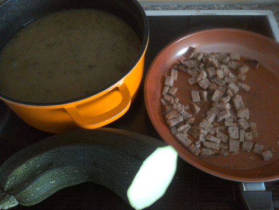 Zucchinisuppe mit geroesteten brotwuerfeln