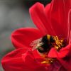 Die Hummel, sehr schön anzusehen mit ihrem schwarz- gelb- und weißfarbenem pelzigen Körperchen und den durchsichtigen silbrig filigranen Flügeln, in dieser kräftig roten Blüte. Emsig trinkt sie den Nektar aus dem Kelch und wenn sie fortfliegt, nimmt sie Blütenstaub mit, den sie zu anderen Blüten trägt und so für deren Fortpflanzung sorgt. Ein wunderbar harmonisches Zusammenspiel der Pflanzen- und Tierwelt in der Natur.