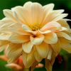 Sehr schöne Gelb- bis Orangetöne der Blütenblätter und kräftig gelb die Staubgefäße. Der hell- und dunkelgrün gefleckte Hintergrund bringt die Dahlie schön zur Geltung.