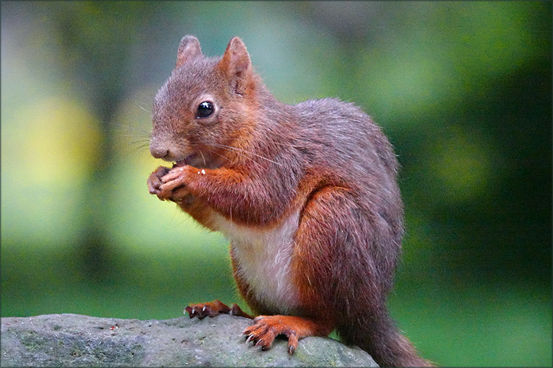Es ist wunderbar, wenn man jemandem von Herzen hilft, ohne Wenn und Aber, man spürt das Gefühl, sich selbst beschenkt zu haben. Wer das einmal für sich entdeckt hat, wird sich selbst auf diese Weise täglich reichlich beschenken, ohne dabei auf ein Dankeschön zu warten oder zu erhoffen, der jenige ist mit sich selbst glücklich und zufrieden, und die Liebe in seinem Herzen wächst mit jedem neuen Tag ein Stückchen mehr. Das gilt auch bei der Liebe zu Tieren, ja auch zu Pflanzen, zur ganzen Natur, das ist eine Grundeinstellung, eine Lebensweise, die Leben fördert und glücklich und zufrieden macht. Auch das Eichhörnchen hier auf dem Bild lebt auf diese Weise, es bekommt, und gibt sich selbst dafür hin, es gibt seine ganze Schönheit und Lieblichkeit. Das ist auch das Grundprinzip der Natur, die alle Geschöpfe auf der Erde nährt und am Leben hält. Das Bild verströmt Ruhe, Harmonie und Frieden.