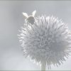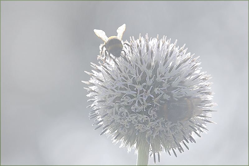 Sehr schön zu sehen die im Licht leuchtenden Flügel und Beinchen der einen Hummel oben auf der Blütenkugel, die andere Hummel unterhalb der Blüten im Schatten, kaum zu erkennen und ein leuchtender Kreis um die Spitzen der Blüten. Ein fotografisches Kunstwerk im Morgennebel, reizvoll und schön.