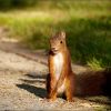 Süß sitzt das Eichhörnchen aufrecht in der Sonne