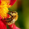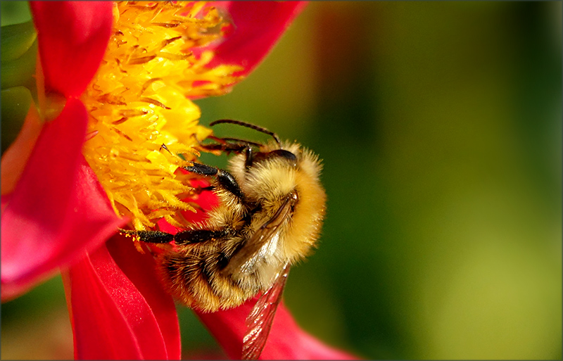 Ein sehr schönes Bild, die süße Hummel in ihrem gelb und bräunlich pelzigen Kleid mit den bräunlich filigranen durchsichtigen Flügeln, trinkt emsig den süßen Nektar aus den gelben Kelchen der roten Ende-September-Blüte. Der dunkel- bis hell- und gelbgrün gefleckte Hintergrund bringt das Tierchen schön zur Geltung.