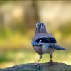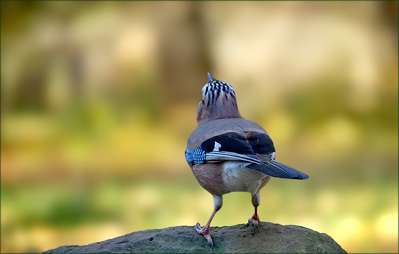 Zum Abflug bereit, steht der Eichelhäher auf der grauen