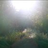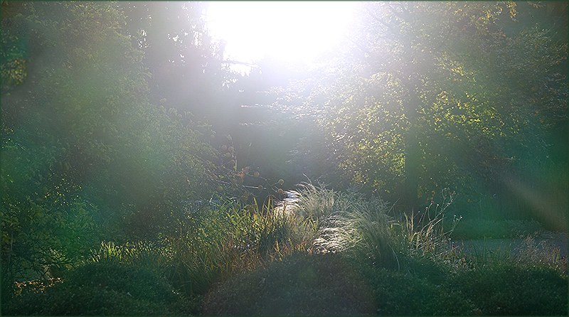 und Gräsern im Morgennebel, durch den das Sonnenlicht