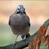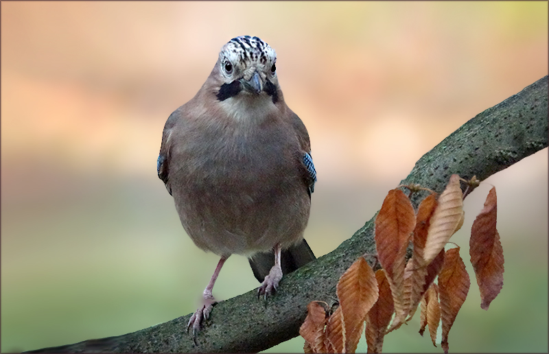 Der Eichelhäher steht sicher mit seinen Krallen auf dem grünen