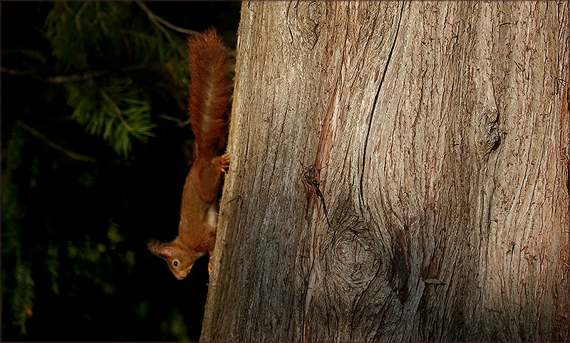 in der linken Hälfte das Eichhörnchen am Stamm