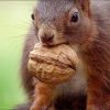 Sicher mit den Zähnen, hält das Eichhörnchen die Walnuss