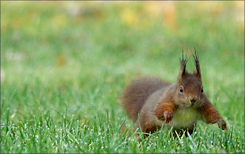 unser süßer Fratz hüpft durch´s regennasse Gras ins Trockene