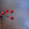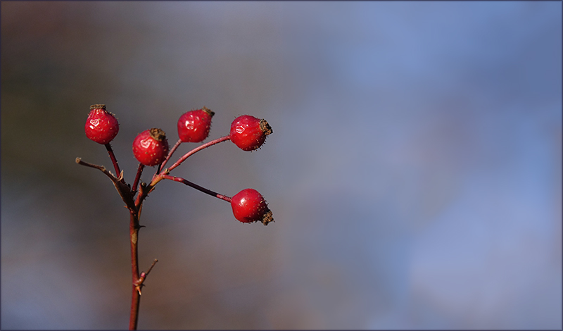des Fotografen. Die kleinen reifen Hagebutten an den dunkelroten